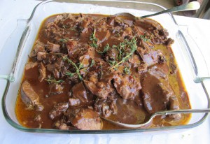 A few things to consider for the success of this dish – do not short cut on the timing, it needs slow and long cooking. The meat needs to be covered with braising fluid but if that is not possible it needs to be turned occasionally. A good roasting pan, casserole dish or oven proof pot with a well fitting lid are ideal but covering the meat with tin foil is also acceptable – it’s just a bit of pain to lift the foil, turn and baste the meat and reseal the foil repeatedly, but it still works.