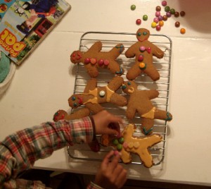 I would love to give you the gingerbread men recipe, but it had to improvised a bit as the kids added about 4 times too much butter to the recipe by accident and I had to add a bit here and a lot there to get the consistency right again. They ended up tasting pretty nice too, but I have no idea how I got there.