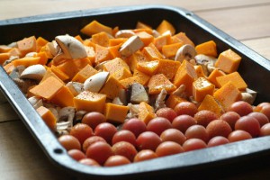 Chop mushrooms into quarters and butternut in small-ish pieces and put on a baking tray with cherry tomatoes. Douse them all in lots of olive oil, salt, pepper, and roll around. The tomatoes also get some sugar on top. Into a pre heated oven at about 200 degree for 15 minutes or until the butternut has cooked through. For the last few minutes turn on the grill. Mushrooms should be brown, butternut soft and tomatoes mushy and juicy. Toss together with pasta and top with some rocket, basil and of course lots of parmesan cheese. For this dish I think it’s important to get a good one and grate it into big flakes. It just adds another texture to the dish.