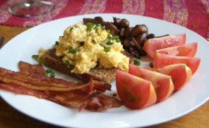 I am a big fan of a full house breakfast but I am always amazed at how often they are just rubbery grease fests. It doesn’t have to be that way. Now I’m the last person to hold back on the butter and cream but there is a threshold where rich and creamy becomes greasy and nauseating. I cooked a brunch last Saturday which for me hit the spot 100%. Creamy scrambled eggs with fresh chives on whole wheat bread, crispy grilled bacon, sautéed mushrooms and fresh tomato. It was the perfect balance of salty fry up with a fresh wholesome edge which left me feeling good rather than guilty.