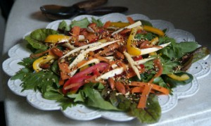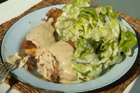 The salad is a recipe from my German grandmother – butter lettuce tossed in a garlicy sour cream dressing and topped with chopped chives. It really is heavenly. You start by making the dressing in the bowl you are going to toss the leaves in. Start with a few spoons of sour cream (about 1 Tbsp per person eating) then add some lemon juice, pressed garlic, salt and black pepper (a pinch of sugar if desired). Mix it up and toss the leaves through it. Top this with chopped chives. So simple but way more delicious than you can imagine. You can substitute the sour cream with yoghurt, but it really just isn’t the same.
