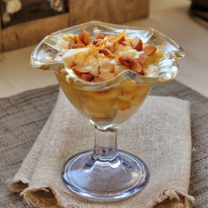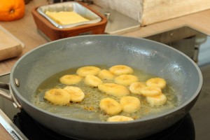It is simply sliced bananas fried quickly with a bit of butter, honey, orange juice and zest. This is then served with Greek yogurt, sweetened and flavoured with vanilla. The dessert is topped-off with slivered almonds and some extra orange zest.