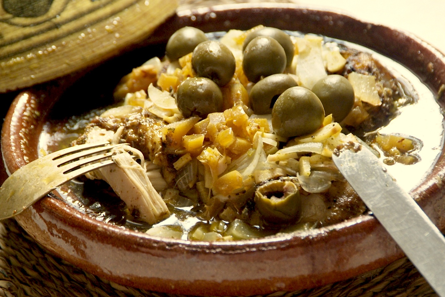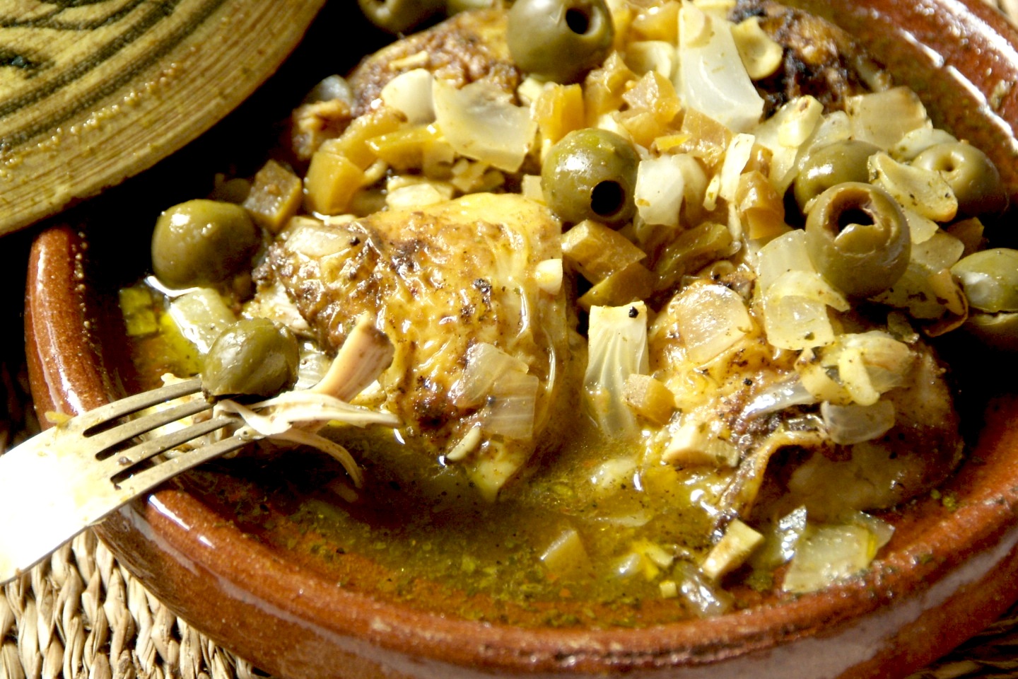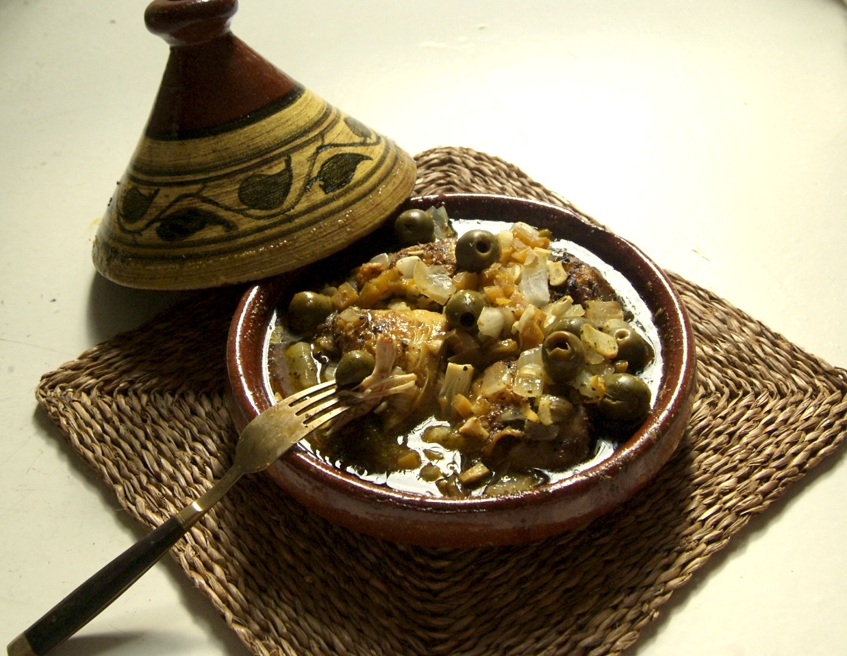 Pre heat your oven on grill and place the rack in the middle of the oven. Mix the spices with the oil and rub onto the chicken thighs. Lie them skin side up into your tagine base on top of the chopped onions. Grill the chicken for about 15 minutes until the skin has browned. Remove the tagine and add the remaining ingredients and cover with the lid.