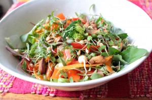 This was my lunch yesterday. Rocket, microgreens, sprouts, steamed broccoli, shaved carrot, red pepper, tomoto, pickled ginger and a handful of raw almonds. I dressed the salad with lemon juice, zest, olive oil, the juice from pickled ginger, garlic, salt and pepper.
