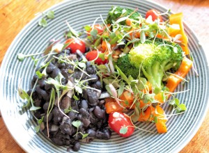 This was lunch on Monday. I had done a big shop of organic bean, seeds, nuts and pulsars at Komati foods down the road. I soaked and cooked up some black beans, to which I added only salt, pepper a dash of olive oil and then fresh chopped onion. I served that warm with a side salad very similar to the salad I mentioned above. The beans were amazing. I had two more helpings after this.