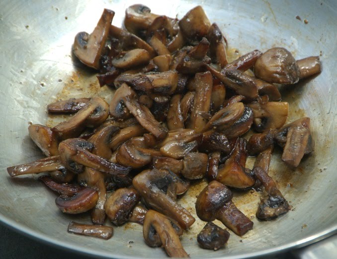 Sauté the mushrooms until most of the water content of the mushrooms has evaporated. The amount of water they will release depends on the varietal and the freshness of the mushroom and may take longer or shorter based in that. You want your mushrooms to have at least halved (almost quartered) in size. They need to have lost all there sponginess and be slightly meaty in texture. This should all take between 10 – 15 minutes.