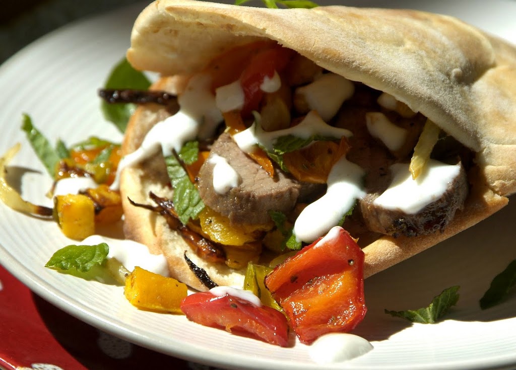 Toast the pitas in the oven until they puff up. Slice a hole about 1/3 of the way along the edge of the pita and with the knife loosen the inside creating a pocket. Layer roast veggies, yoghurt sauce and lamb evenly in the pita and serve immediately.