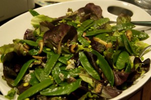 It was a butter lettuce, basil and rocket combo pack, crumbled blue cheese, steamed edamame beans and mangetout peas and pan fried exotic mushrooms (also a combo pack from woollies). It was light and fresh but at the same time substantial and wintery! Somebody else whipped up a light vinaigrette and the rest was salad history.