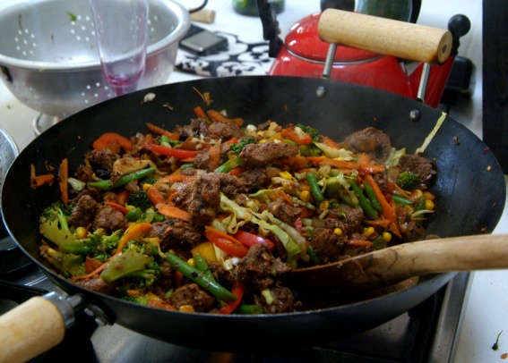 Heat the remaining oil in the wok and stir-fry veggies for a few minutes. Return the beef to the wok. Add the remaining sauce mixture, stock and cornstarch paste and cook, stirring continuously, until thickened. The veggies should still be al dente (a bit crispy).