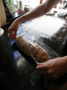 Spread the chicken liver pâté over the cooled fillet with a butter knife. Place the fillet along the long edge of the bacon. Using the cling wrap to lift and roll, wrap the fillet in the bacon, seal the cling wrap and twist the ends to create a tight wrapping around the fillet. Leave this in the fridge to cool completely.