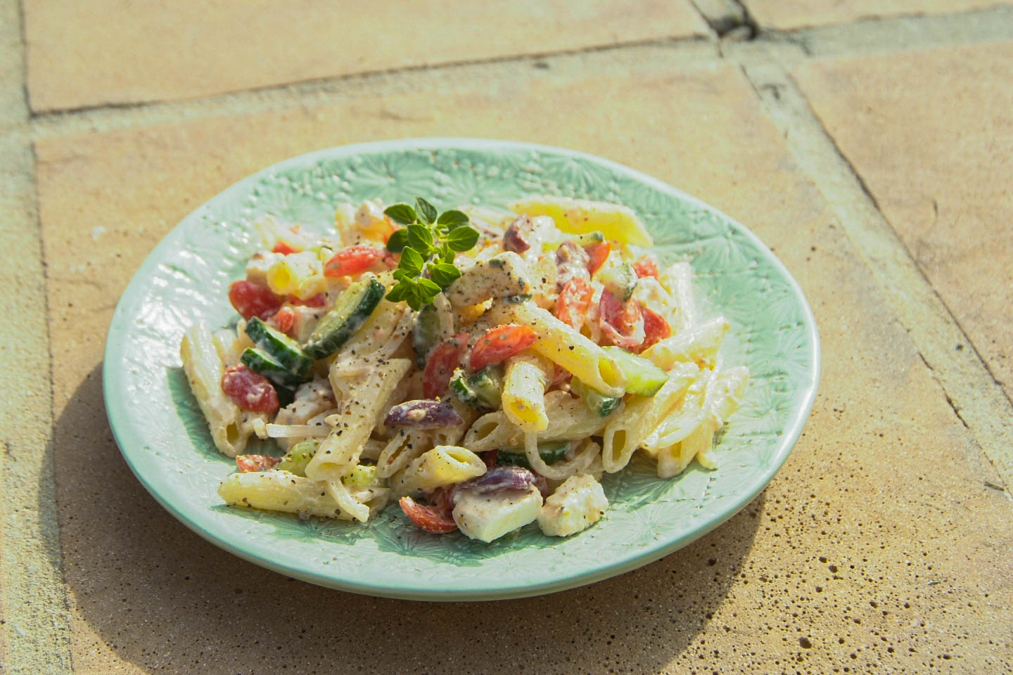 I had initially imagined a simple mayonnaise sauce poured over cold pasta, but it was Greek yogurt with honey, garlic, herbs and mustard, lots of seeded olives, baby rosa tomatoes, fresh oregano… mmm. The perfect healthy greek salad recipe!