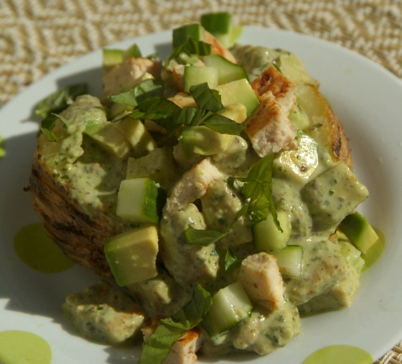 Combine the yogurt, pesto, chutney, salt and pepper. Add the chicken breast chopped into bite sized pieces and the avo. Mix lightly and spoon over hot baked potatoes.