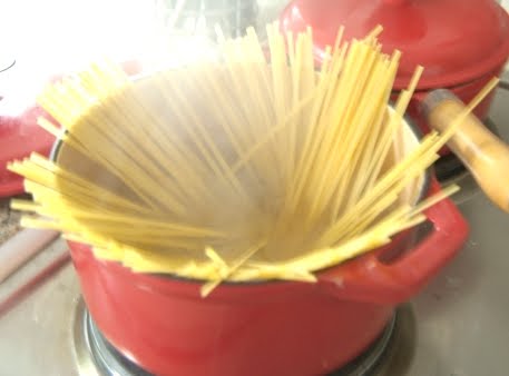 It astounds me how many people struggle to get their pasta not to stick together when cooking it. Once the water is simmering, hold the pasta in a bunch and place it down to the center of the pot, allow it to fan out as shown in the picture below. After a few minutes gently push the tips of the pasta down until the pasts has submerged. Place the lid on the pot and in a few minutes stir the pasta around the water a little ensuring that the hot water has coated all the strands. Cook and drain. Toss with a little oil to ensure that no further sticking occurs.