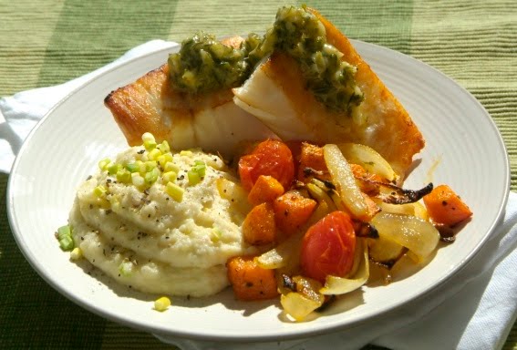 I was having a bit of a comfort food day yesterday. The weather was balmy but distinctly autumn. I had been meaning to recreate a sauce for fish which I made while I was in Stilbaai last week, which got rave reviews. So I defrosted the butterfish steaks which I had bought from the Breco factory shop and went about putting together some appropriate side dishes.